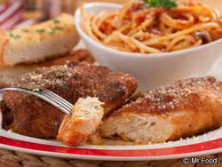 In a shallow dish, combine spaghetti sauce mix, bread crumbs, and cheese. Place tomato sauce in another shallow dish. Dip chicken pieces in tomato sauce, shaking off excess, then into bread crumb mixture, coating completely.