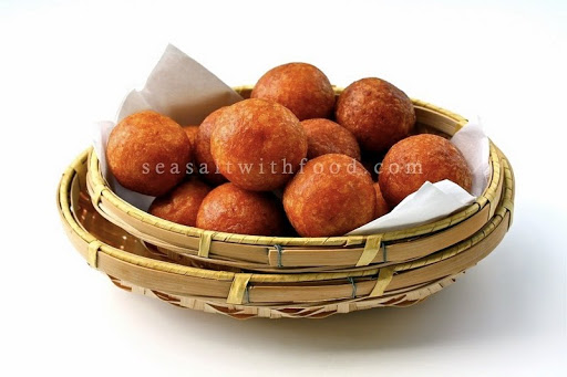 Boil the sweet potatoes in a medium pot until tender, 20 to 30 minutes, depending on size of potatoes. When cool enough to handle, mash the potatoes in a potato riser or masher. (If you are using a masher, you will have to peel the potatoes first) Place the sweet potatoes in a large bowl and add in the glutinous rice flour, corn flour, sugar, grated coconut, and sea salt. Mix with your hand to get soft dough. Knead lightly to form a smooth dough. Pinch a small piece of dough (about 15 g each) roll them in your palm to form a smooth ball. Heat the oil in a deep fryer or heavy pan over low to moderate heat. Put in a cube of potato – when potato is nicely colored, the oil is hot enough to fry the sweet potato balls. Fry until golden, remove and drain on a paper towel. Serve immediately.