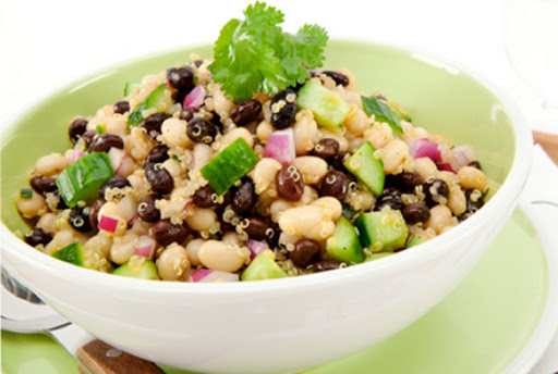 Add quinoa, black beans, navy beans, cucumber, onion, jalapeño pepper and coriander; toss to combine.