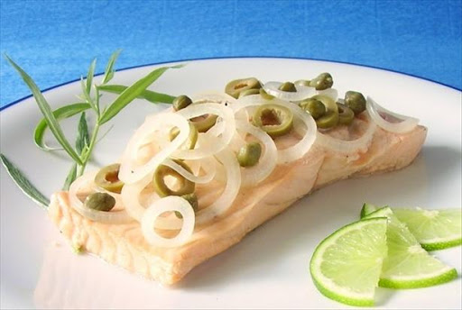 Yum! Salmon is poached in lemon, champagne, olives, capers, and tarragon. The only fat in this is the healthy fat from the fish!