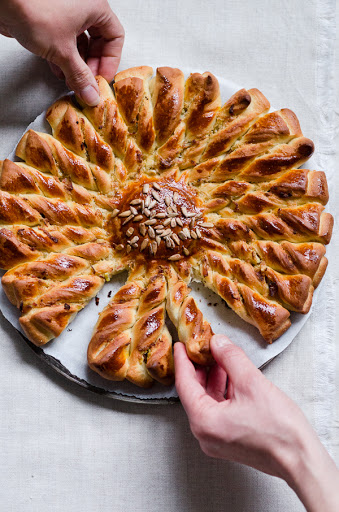 In a large bowl mix together flour and salt. Crumble the fresh yeast over the flour add the sour cream and pour the room temperature milk. Knead the dough for 5 minutes. Let it rest for 20-25 minutes and add the olive oil and knead again for 5 minutes. Let it rest for half an hour or until it rises. In the meantime, mix together in a bowl the sour cream, pancetta, green onion, cheese, mustard and seasoning. Divide the dough in two equal parts and with a rolling-pin flatten each piece of dough into a disc (25cm diameter). Preheat oven to 200ºC. On a baking tray lined with baking paper, place the first disc and spread the sour cream filling, leaving half centimetre free all around the edge. Place the second disc on the top. Place a glass in the centre and press it lightly. Using the back of a knife, divide the dough in four equal parts. Keep on dividing each quarter into two equal parts and then each part in 3 equal segments. You should have 24 segments. Hold the tip of each piece and twist it three times. Remove the glass in the centre of the dough, wash the top with an egg yolk and toss sunflower seeds in the centre where the glass was standing. Bake for 25-30 minutes or until nicely golden on top. Remove from oven, invert the bread on a large plate and remove baking paper. Let it cool on a wired rack.