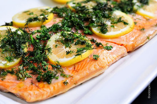 Simply place lemon slices on top of your salmon filet, then top with a mix of chopped dill and parsley.