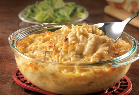 Stir the soup, cheeses, milk and black pepper in a 1 1/2-quart casserole. Stir in the pasta.