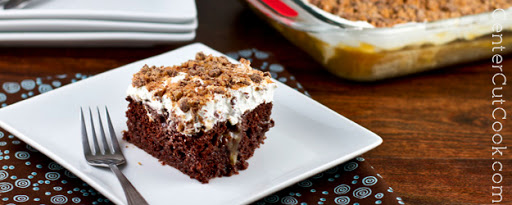 Let stand for over an hour until the cake has completely cooled. Frost with the cool whip topping and sprinkle with crushed Heath bars. Refrigerate.