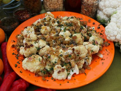 Toss together the cauliflower, raisins and Marsala, pine nuts, and capers. Add the shallot mixture to the vinaigrette and pour over the cauliflower. Stir in the parsley and serve.