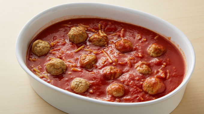 Grease 12x8-inch (2-quart) baking dish. In greased baking dish, combine uncooked spaghetti, water and spaghetti sauce; mix well. Add meatballs; turn to coat with sauce. (Cover spaghetti completely with sauce.) Cover tightly with foil; refrigerate at least 8 hours or overnight.
