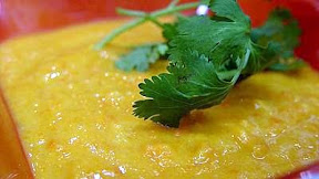 Place a large pot over medium-high heat and add oil. Add the onions and sauté until they are golden brown and soft. Add the carrots, coconut milk, rice, lentils and orange juice. Bring to a simmer and continue cooking until the rice and lentils are tender. Add the ginger and salt. Puree with an immersion blender, stand blender or food processor. You may also serve ‘as is’. Garnish with cilantro leaves