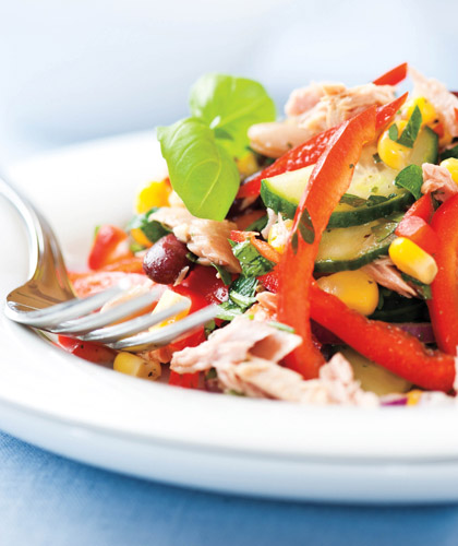 1. In medium bowl, flake tuna with fork. Add beans, corn, pepper and cucumber.