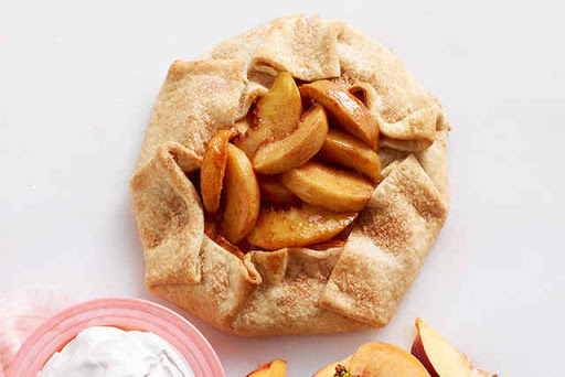 Reserve 1 Tbsp. of the remaining sugar mixture. Toss peaches with remaining sugar mixture; spoon over cream cheese mixture. Fold edge of crust over peaches, leaving center uncovered; sprinkle with reserved sugar mixture.