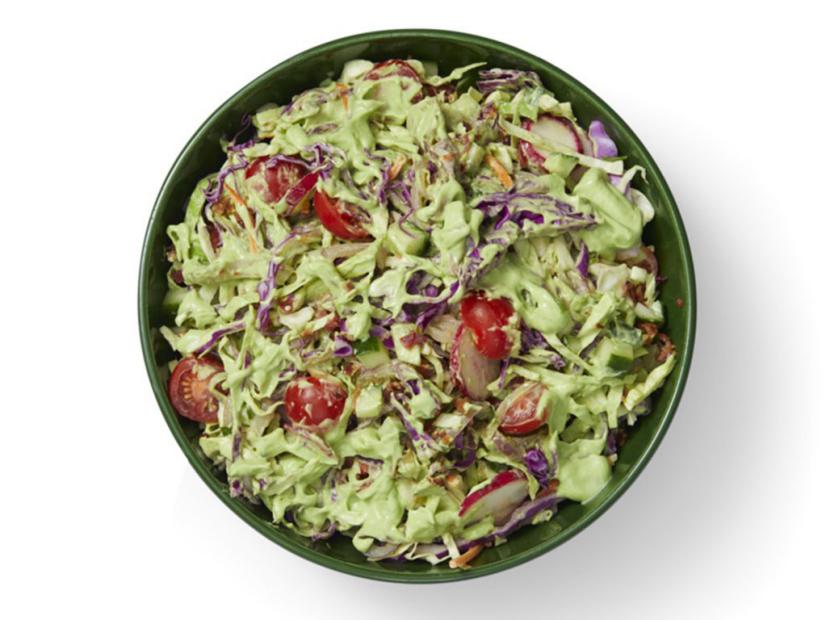 Combine coleslaw mix, sliced radishes, cherry tomatoes, cucumber and the red onion in a bowl.