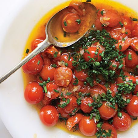 Cut half of cherry tomatoes in half. Heat 1 tablespoon oil in a medium saucepan over medium heat. Add shallot and cook, stirring often, until softened, about 4 minutes.