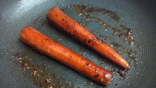 4. To cook the carrots, spray a medium skillet with olive oil cooking spray. Turn the heat to medium and place the carrots and about 1/2 cup of the marinade into the skillet. Heat the carrots for approximately 8 to 10 minutes, or until warm.