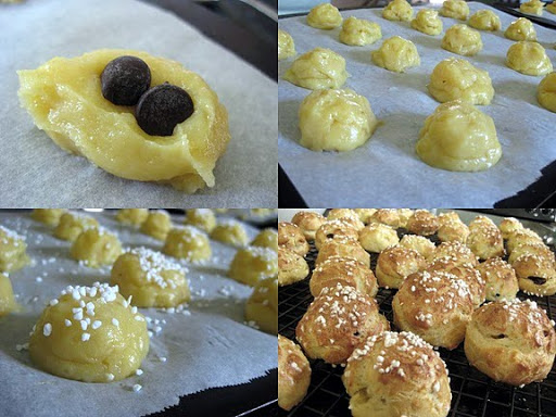 In a heavy-bottomed pot, bring 1/2 cup of water, 1/2 of whole milk, 1 teaspoon salt, 3 tablespoons of sugar, and 7 tablespoons of butter (cut into 7 pieces) to a gentle boil over medium heat. Once the mixture starts bubbling, add all at once 1 1/2 cups all-purpose flour to the milk mixture and stir briskly with a wooden spoon. You want to "cook" the flour mixture for 30-40 seconds. The mixture is ready when the flour is fully incorporated and forms thin crusty film on the bottom of the pot. At this point, immediately take the pot off the heat and start adding eggs to the dough, one by one. (You should have 6 large eggs on hand, though you may only need 5 depending on the humidity in the air or the type of flour you use, etc.) Stir very briskly with a wooden spoon after each egg is added. The first 2 additions will require quite a bit of muscle work, but after that the dough will slowly become a batter, making it easier to stir. After the 5th egg has been fully incorporated, stop to check the status of your batter. Scoop up some batter with the wooden spoon and see if the batter in the bowl detaches itself from the batter on the spoon and slowly folds over itself. If it does, you don't need the 6th egg. If the batter forms a stiff peak instead of folding, you need to add one more egg. Preheat the oven to 400 degrees F. Line two baking sheets with parchment paper. With two small spoons, drop the batter onto the prepared sheets by teaspoonfuls, leaving 1 1/2 inches of space between each round. You want to have about 18 rounds. At this point, don't worry about symmetry yet. We'll fix that later. Bury 2-3 chocolate chips inside each round and top them with the remaining batter. You should end up with 36 one-inch rounds (which will almost double in size in the oven).