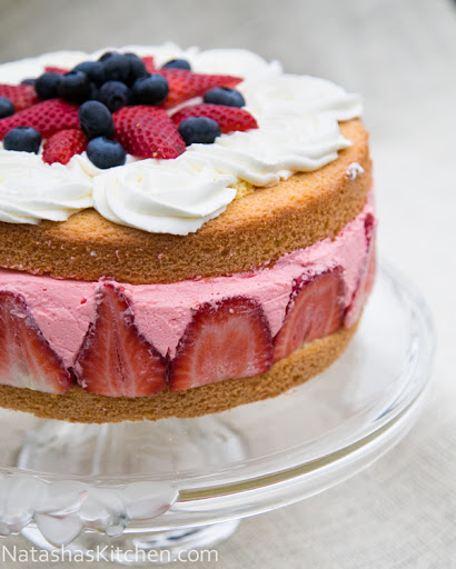 Pile fruit in the center in whatever design you like; they look good just piled up too. Put back in the fridge a couple more hours or overnight to allow the jello to fully set before serving or the cake will be too dainty and will fall apart easier when sliced. Also, you take it out of the spring form mold, fold some plastic wrap and wrap it around the jello part of this cake to keep it in place while it firms up fully.