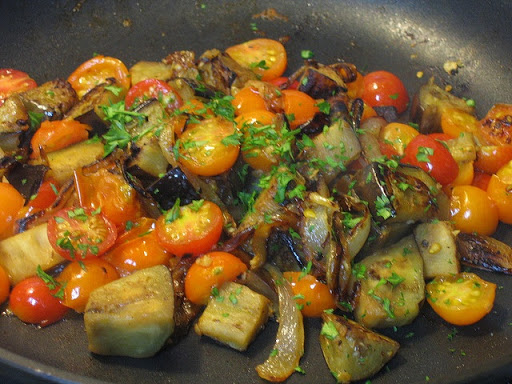 Saute onion in oil for a few minutes, add eggplant and zucchini and simmer a few more minutes. Add garlic, tomatoes, mushrooms and spices and simmer for about 5 - 10 minutes.