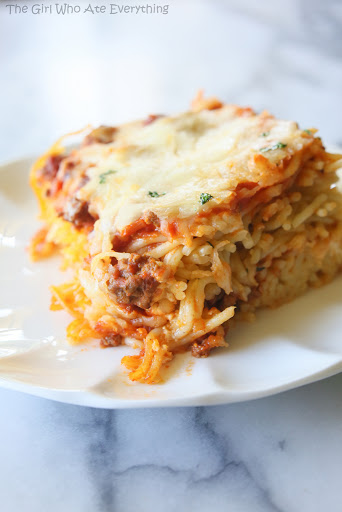 Place half of the spaghetti mixture in a greased 9x13 baking dish. Top with half of the ricotta cheese, meat sauce and mozzarella cheese. Repeat layers.