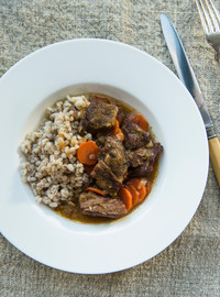 Répartir l’orge, le boeuf et les carottes dans les assiettes.