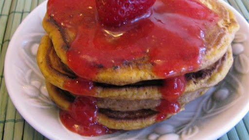 3 Puree strawberries in a food processor until smooth. Top pancakes with pureed strawberries.