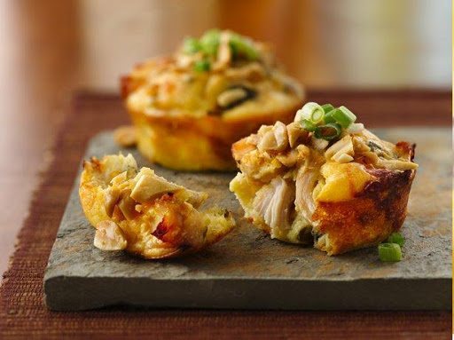 Bake 30 to 35 minutes or until toothpick inserted in center comes out clean and tops of pies are golden brown. Ten minutes into baking, carefully open oven and sprinkle 1/2 tablespoon peanuts on top of each muffin. Close oven door and finish baking. Cool 5 minutes. With thin knife, loosen sides of pies from pan; remove from pan and place top sides up on cooling rack. Cool 10 minutes longer; serve with sliced green onions.