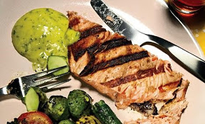 Arrange Blistered Baby Zucchini, Baby Pattypan Squash, and Grilled Tomatoes around salmon.