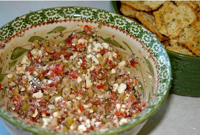 One of our favorite people in the whole world is someone Josh used to work with, Deanne. She and her family had us all over for dinner the other night, and she made this wonderful appetizer! I didn't know what to name this 'dip', but since Deanne made it- it's suits this well to call it Deanne's Dip! :o) This is AMAZING! :o) It comes with a warning that it's highly addictive.....honestly most of you are thinking- olives? gross. Cause I'm totally one of those people, I'm not picky about most anything but I know I don't like olives. And if it wasn't for Deanne making this I don't think I would have ever made it just by reading the ingredients. But it tastes nothing of olives. You don't even know they're in there! I made this, this weekend at our family 'reunion'/ vacation with all my family there and I had a few cousins that did not want to try it cause they didn't like olives either, but I made them and they agreed, amazingly yummy and you can't tell you're eating olives! Another one of my cousin's commented on how amazing it smells, it smells like an Italian Resturant! Someone said how healthy it is for you, and how much they love Feta. My dad, I should have made him his own bowl. All in all, it was a hit, everyone LOVED it, and I had to reserve a bit for my cousin who was in the shower because it was going too fast! Thanks Deanne for having us over and extending this recipe to the whole world ;o)~