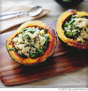 3. While squash is cooking, prepare the quinoa. Bring 1 1/2 cups water to a boil and add the quinoa, cover and simmer for about 10 minutes until the liquid is absorbed. Remove and transfer to a mixing bowl. Add the shallot, lemon juice, cardamom, olive oil, and stir. Allow to cool down about 8 minutes, then add the basil, pear and greens to combine. Don’t add them when the quinoa is piping hot, otherwise it will wilt them into a brown mess.