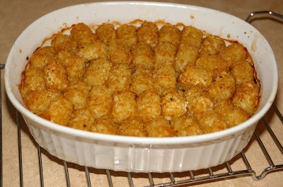 Simply layer ingredients in pan (I used a 1 1/2 quart Corningware, or pie plate or 8x8) 1. Season the hamburger and press onto bottom 2. a whole lot of cheese 3. Can of soup, 3/4ths drained 4. Tater Tots, then season again. Bake for 350 for 1 hour or until done.