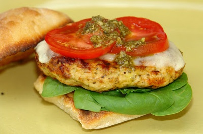 1. In bowl combine ground chicken, pesto, parmesan, garlic, and salt. Shape into four 1/2-inch-thick oval patties.