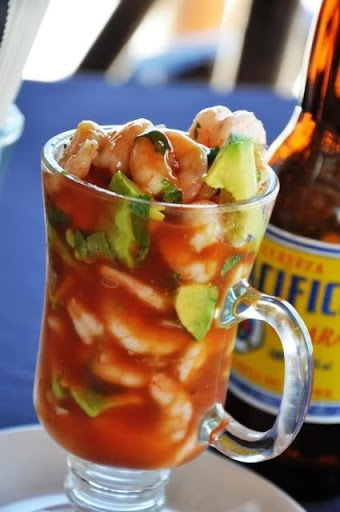 Chop all items, including shrimp into bite size pieces, add V-8 and clamato juice. Refrigerate and enjoy!
