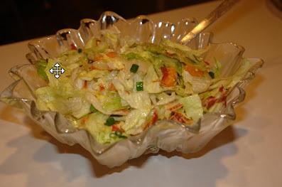 Make up the dressing in a small container. Place in the refridgerator. Toss the greens with the bacon, onions, and oranges. Place in refridgerator. Top with dressing just before serving. (Optional- to add a 1/4 c. of chopped almonds or pecans)