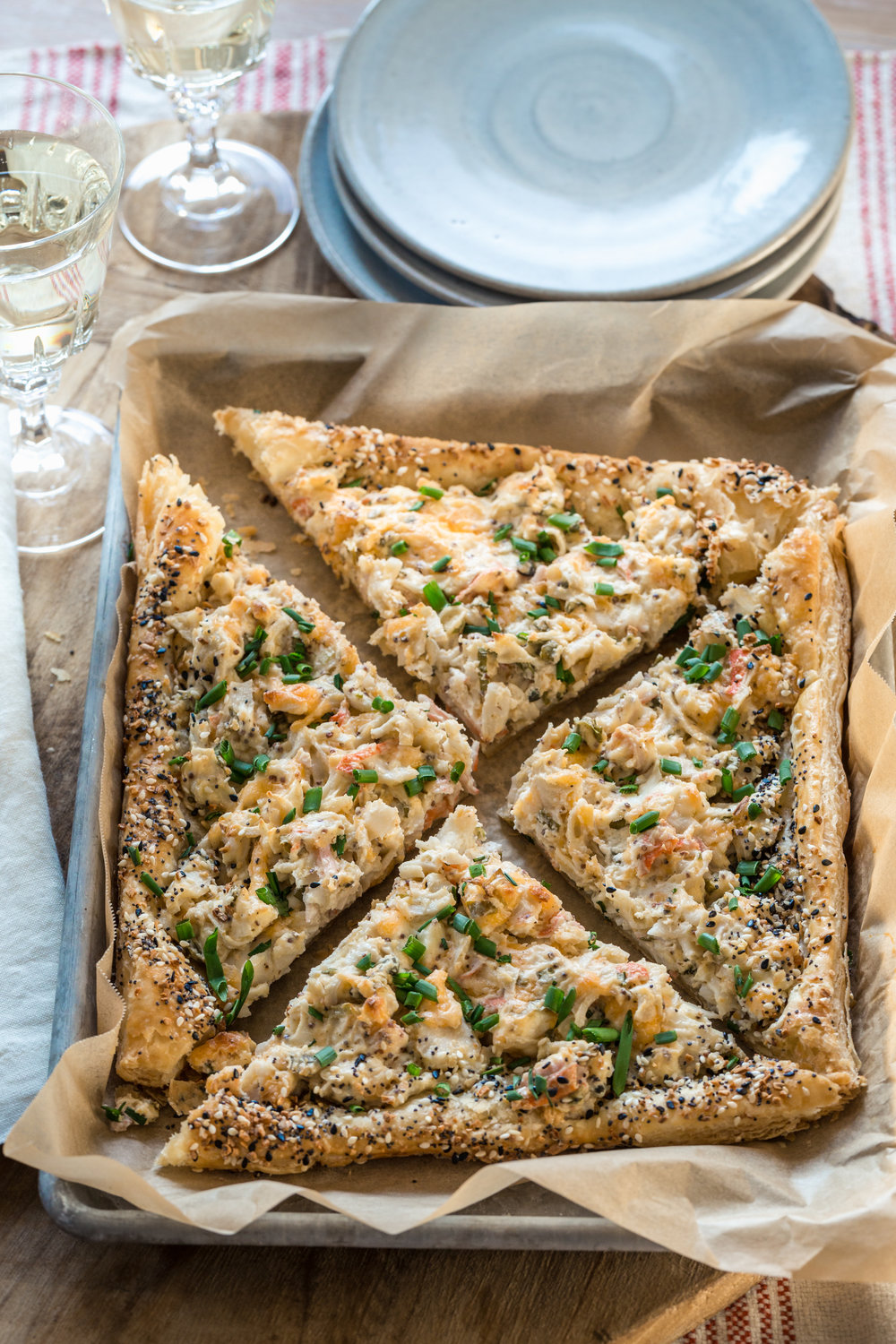 Line a baking sheet with parchment paper. Preheat oven to 375°F. Place thawed but ice cold puff pastry in the middle of baking sheet. Mix together crab, cream cheese, green onions, shredded cheddar, Dijon mustard, hot sauce, and salt and pepper evenly distributed throughout cream cheese. Mixture will be thick. Place mixture in the center of puff pastry and smooth it out, leaving a 1-inch rim of dough exposed around the edge. Brush egg wash along exposed dough and evenly sprinkle everything bagel seasoning along egg washed dough. Bake for 30-35 minutes or until dough has puffed around crab and cream cheese and the entire pastry is lightly browned and completely cooked through.
