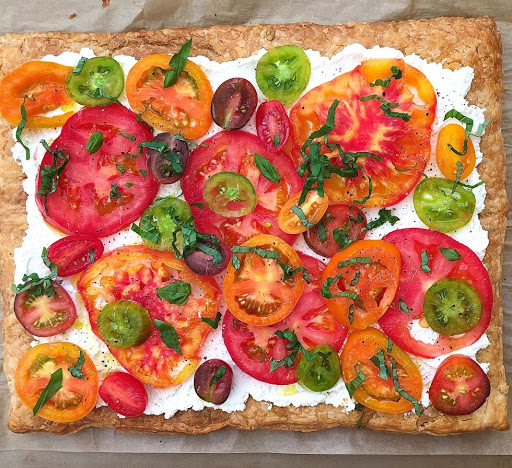 Spread ricotta mixture over cooled puff pastry, leaving 1/2-inch border on edges. Arrange tomatoes on top (varying color and size) and sprinkle with basil. Season with salt and pepper, and drizzle with olive oil.