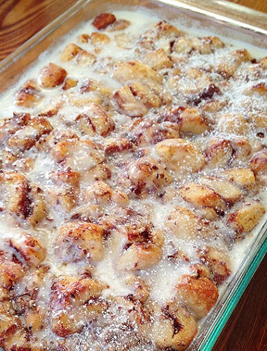 3. Open canned cinnamon rolls, slice each cinnamon roll into eighths. Place cinnamon roll pieces into the bowl of egg mixture and toss to thoroughly coat. Then pour the pieces, coated in egg mixture, into the greased baking dish and spread out evenly. Any remaining egg mixture, you can pour or rush over top of areas that look like they might get dry. Sprinkle with pecans.