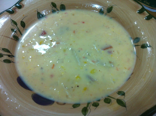 In a small bowl, whisk together flour and the remaining 1/2 cup cold water; stir into soup. Bring to a boil and stir for 2 minutes or until thickened. Stir in chicken. Reduce heat to low and add cheese cubes; stir until just melted.