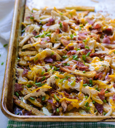 Remove fries from oven and top with the chicken, cheddar, mozzarella, and bacon. Return to the oven until the cheese melts, 3-5 minutes. Top with chives. Serve immediately.