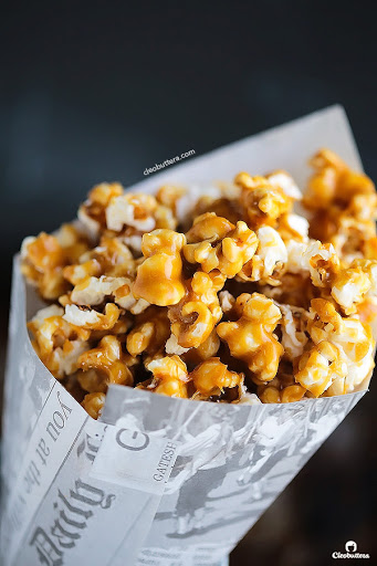 Immediately pour the caramel over the popcorn and using the buttered spatulas, toss well to evenly coat all the popcorn.