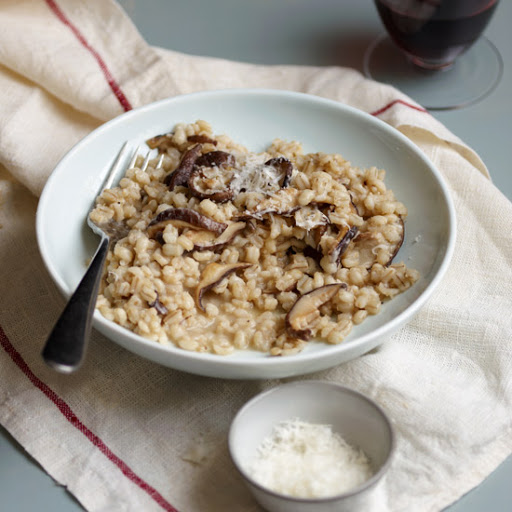 In a large saucepan, heat the olive oil. Add the mushrooms and garlic and season with salt and pepper. Cook over moderately high heat, stirring, until the mushrooms are softened and the garlic is fragrant, about 4 minutes. Add the barley and stir to coat. Add 1 cup of the warm stock and cook over moderately low heat, stirring constantly, until nearly absorbed. Continue adding the stock 1 cup at a time, stirring constantly between additions, until the barley is al dente and suspended in a creamy sauce, about 25 minutes. Stir in the butter and cheese. Season with salt and pepper and serve.