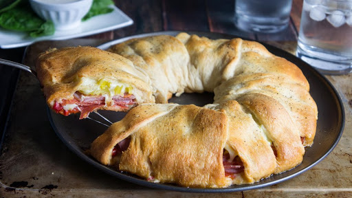 Unroll both cans of dough; separate into 8 rectangles. On ungreased 12-inch pizza pan, arrange rectangles in ring so short sides of rectangles form a circle in center. (Dough will overlap; half of each rectangle will hang over edge of pan. Dough ring should look like a sun.)