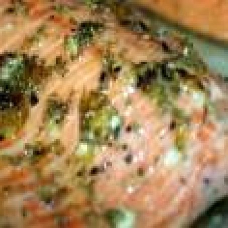 Prepare a baking or roasting pan by lining it with foil and brushing it with olive oil. 2 Preheat broiler. 3 Mix together all remaining ingredients except fish into a well-blended paste. 4 Place fish skin-side down (if it has skin) on baking sheet, then spread seasoning over flesh. 5 Broil fish at second rack away from heat for 5 minutes or less, just enough to sear flesh but not burn herbs. 6 Lower fish to 3rd or 4th rack and lower oven heat to 325°F Bake for 10 additional minutes, or until fish is cooked through in the thickest portion. 7 Serve with steamed vegetables, salad, orzo salad, whatever.