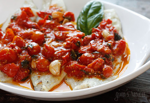 Meanwhile, while sauce is simmering, season fish with salt and pepper and lightly spray with oil. Broil or grill fish on medium het until cooked through (fish is flakey and somewhat translucent). When fish is cooked, top wit tomato sauce.