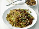 Wipe out the skillet. Return to high heat and add 1/4 inch of vegetable oil. Add one-fourth of the egg mixture; spoon some of the hot oil on top and cook until puffy, 1 to 2 minutes. Flip and cook 1 minute, then drain on paper towels. Repeat to make 3 more omelets. Add the sesame oil to the mushroom gravy and pour over the omelets. Garnish with the remaining scallions.