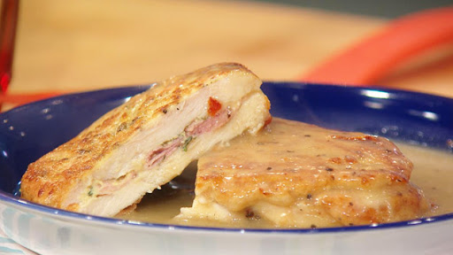 Halve chicken breasts to make 8 cutlets; pound very thin, about 1/4 inch. Season the chicken on both sides with salt and pepper. Spread a thin layer of Dijon on one side of the cutlets and sprinkle with thyme. Fold and arrange 1 slice each of cheese and ham on 4 cutlets, leaving a little chicken exposed all around. Place the remaining cutlets Dijon-side down over the top and press down at the edges to form 4 stuffed cutlets. Dredge in flour.