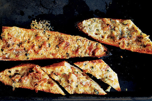 3. Heat broiler. Slice a baguette in half lengthwise, then crosswise. Broil, cut side down, on a foil-lined baking sheet until golden brown, about 2 minutes (watch carefully). Let cool slightly, then spread cut side with garlic paste. Broil until cheese is golden and bubbling, about 2 minutes. Slice.