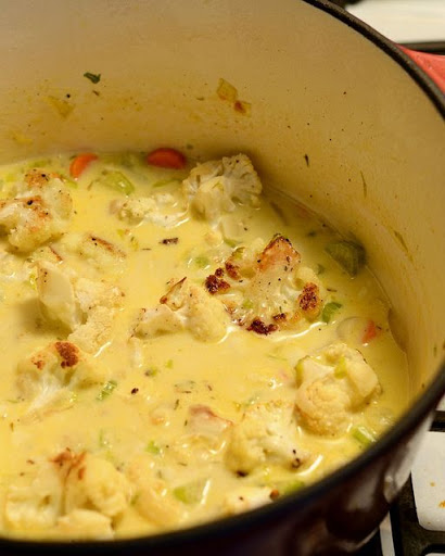 Add the wine and water, whisking to combine with the flour mixture. Then, slowly add in the 2 cups broth. Add the bay leave and roasted garlic cloves. Bring mixture to a boil, then reduce heat to medium-low and simmer for 10 minutes. Add the cauliflower and simmer an additional 5 minutes.