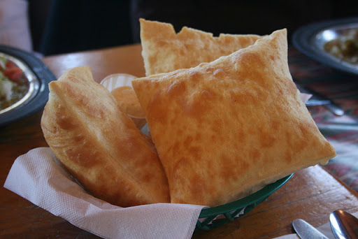 6. Roll dough to a 1/8 inch thickness on a lightly floured board. Cut dough into 4-inch squares and fry until golden on both sides, turning once. (If the shortening is sufficiently hot, the sopaipillas will puff and become hollow shortly after being placed in the shortening.)