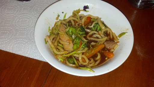 Add the sauce with the broccoli slaw and udon noodles, let simmer.