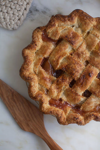 Brush the crust with the beaten egg and sprinkle with the turbinado sugar. Place the pie on a baking sheet and bake for 25 minutes. Turn the heat down to 350 F and bake for an additional 30 minutes, or until the filling is bubbling and the crust is golden brown. If at any time the edges of the piecrust turn a bit too dark, tent the edges with a sheet of foil.