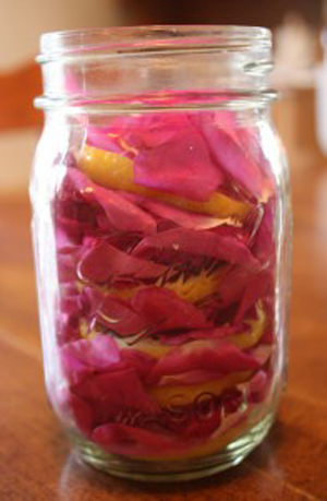 First, you’ll want to prepare your infusion. Layer thin slices of lemon and fresh rose petals in a jar or heat proof measuring cup until you reach near the top.