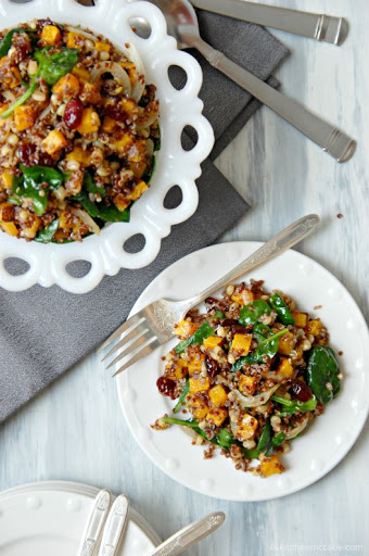 Add the squash, onions, quinoa, wheat berries, spinach and cranberries to the bowl with the dressing; toss until well coated.