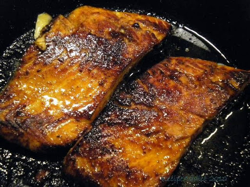 Whisk all of the ingredients together, with the exception of the salmon and set into the refridgerator to marry for about 1 hour. When ready to start your dinner, get your sides starting in advance. This is a really quick cooking recipe. Heat a grill pan or even better a cast iron skillet over medium-high heat and start with skin side down. Baste salmon with half of the glaze and cook for approximately 5 minutes. Do not move salmon around or peek, let it sear to form a good crust. Flip and at this point the skin will be easy to remove from the flesh if you prefer. Baste again with remaining glaze, searing again for about 3-5 minutes.